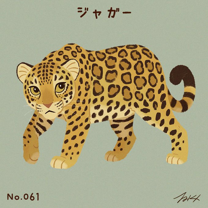 #100猫チャレンジ No.061「ジャガー」 ジャガーは、トラ、ライオンに次いで大型のネコ科で、ヒョウに似ているが比較すると大柄で尻尾はやや短い。泳ぐのが得意で、ワニやカエル、魚などの水生生物も獲物にする。主な生息地・北アメリカ大陸南部。南アメリカ大陸など。体重60kg~150kg ヒョウ属