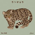 #100猫チャレンジ No.061「ウンピョウ」 ウンピョウは、太くて短い四肢と長い尻尾、被毛は黒い縁取りのある雲状の斑点模様が特徴。標高2000~3000mの森林に生息しており、木登りが得意。主な生息地・インド、インドネシア、タイ、中国など。体重16kg~23kg ウンピョウ属