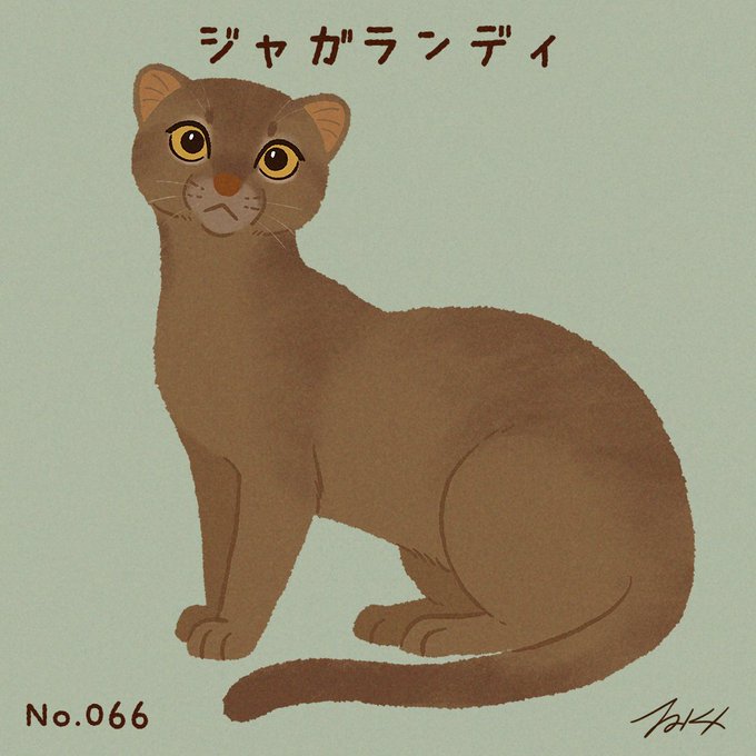 #100猫チャレンジ No.066「ジャガランディ」 ジャガランディは、ほっそりとした体形で首と胴体が長く、イタチやカワウソに似た風貌をしています。川辺や標高の低い草地を好み、泳ぎも得意です。主な生息地・南アメリカ大陸。体重6~8kg ヘルパイルルス属