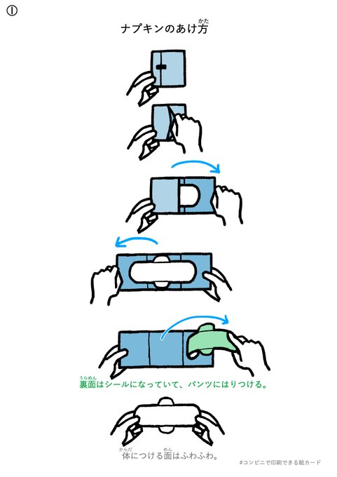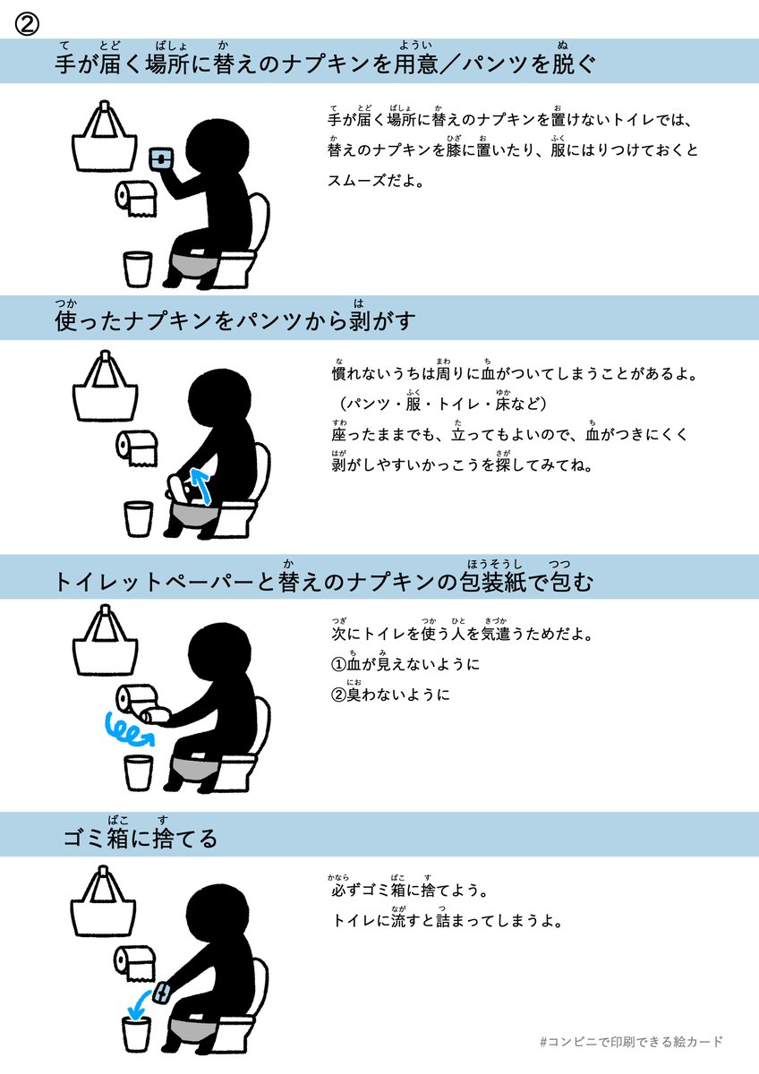 #コンビニで印刷できる絵カード #A4サイズのイラスト ※写真は「ナプキンの取り替え方」です ユーザー番号:7WYBAG3DPM ボランティアで絵カードなどの視覚支援グッズを作っています コンビニの印刷代だけご了承くださいませ bit.ly/2HnTNxr