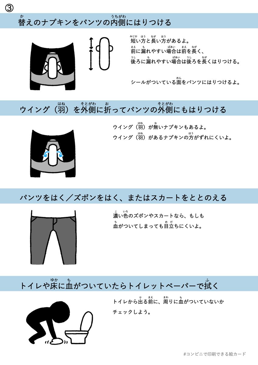 (※再掲だよ~) #コンビニで印刷できる絵カード #A4サイズのイラスト ※写真は #ナプキンの取り替え方 です ユーザー番号:7WYBAG3DPM ボランティアで絵カードなどの視覚支援グッズを作っています。 コンビニの印刷代だけご了承くださいませ。 bit.ly/2HnTNxr