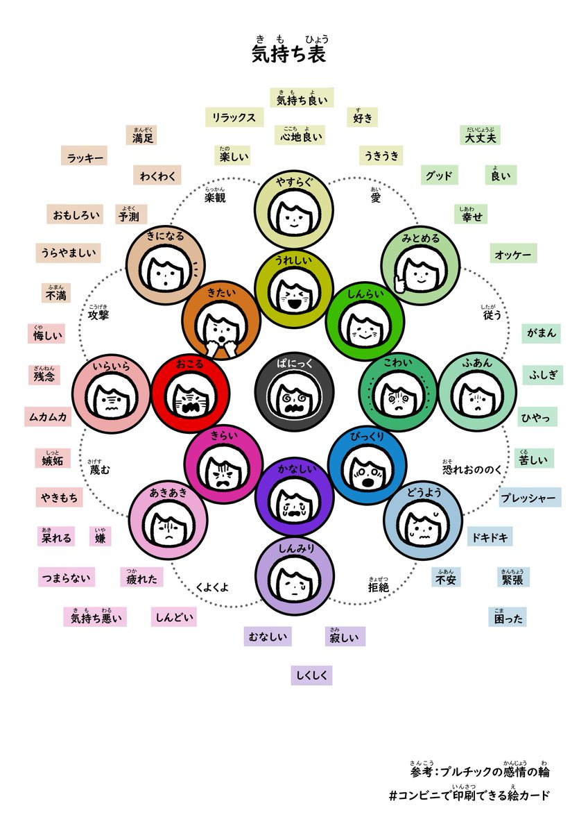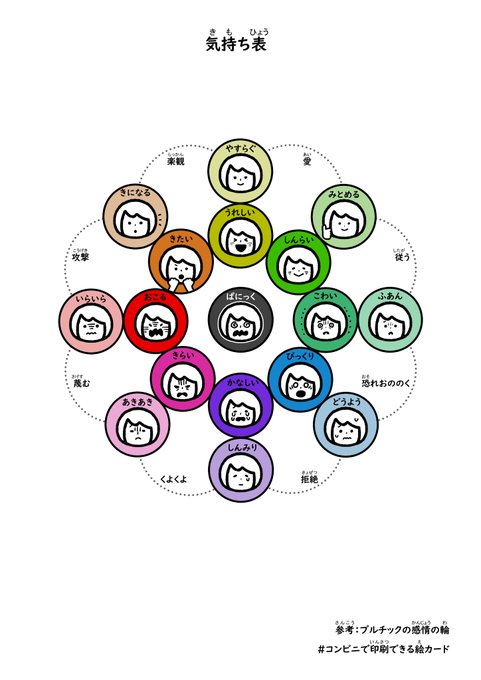 (※再掲だよ~) #コンビニで印刷できる絵カード #A4サイズのイラスト ※写真は #気持ち表 です ユーザー番号:7WYBAG3DPM ボランティアで絵カードなどの視覚支援グッズを作っています。 コンビニの印刷代だけご了承くださいませ。 bit.ly/2HnTNxr
