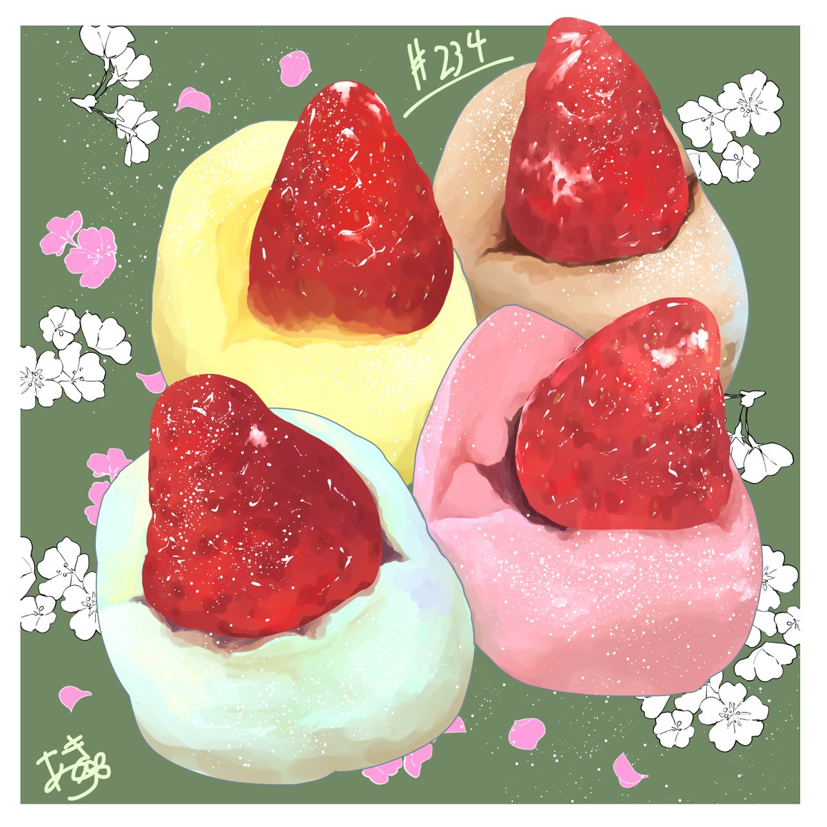 #食べ物イラスト 324枚目「京都成寿庵さんのいちご大福」 ずっと食べたかったもちもちふわふわないちご大福🍓 渋谷で期間限定で出店してて迷わず全種買っちゃった #イラスト好きと繋がりたい #絵描きさんと繋がりたい