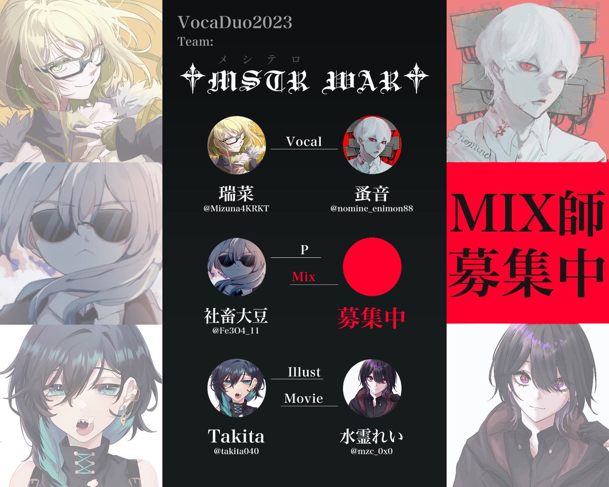 【どうか拡散をお願いします…🙏】 MIX師さんを募集しています! 少々条件付きになってしまいますが、一緒に制作してくれる方がいらっしゃいましたらお声掛けくださいませ…!当チームのメンバーは個性が爆発していてお得です!(?) 詳細はリプ欄に❗️ #ボカデュオ2023参加 #ボカデュオ2023募集