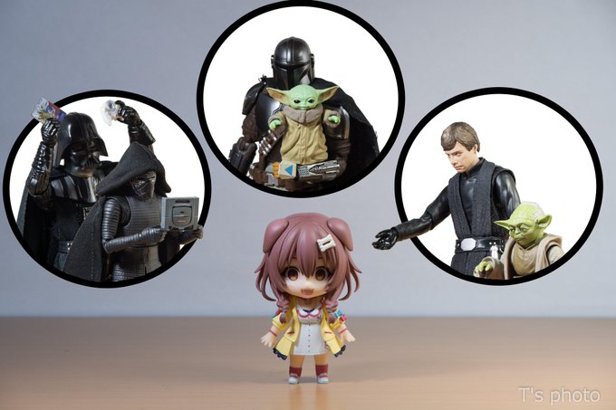 「ライトサイドかダークサイドか。我らの道か。」 黒っぽいのと緑っぽいのしかおらんことに気付いた。 #戌神ころね #できたてころね #オモ写 #ねんどろいど #スターウォーズ
