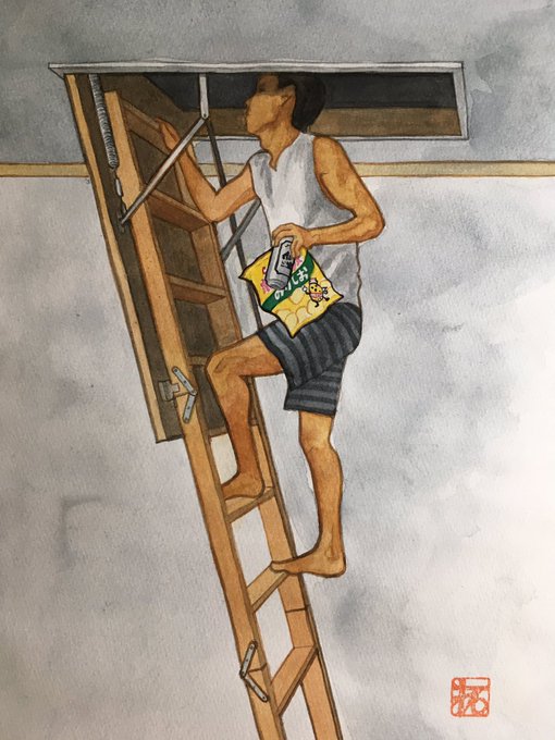 0 7 『しばらくパパを探さないで』 #水彩画 #イラスト #watercolorpainting #屋根裏部屋 #ビール #ポテチ #現実逃避 #忍者屋敷 #三階 #子育て #育メン #コソコソ 20/10/11 09:14