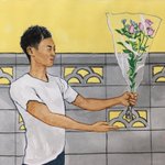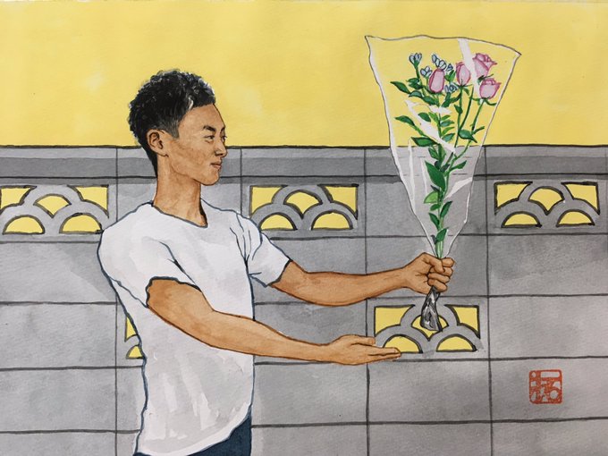 0 5 『君の笑顔と換えてくれ』 #水彩画 #イラスト #watercolorpainting #昭和 #ブロック塀 #薔薇 #ブルースター #男性 #会社スタッフ 20/10/18 08:31