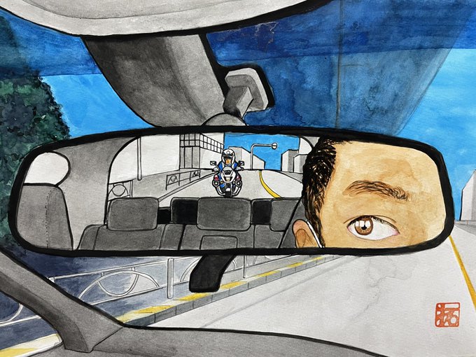 『おお、神よ』 #水彩画 #イラスト #絵画 #watercolorpainting #watercolor #ルームミラー #背後 #白バイ #ohmygod #ホンダ #フリード