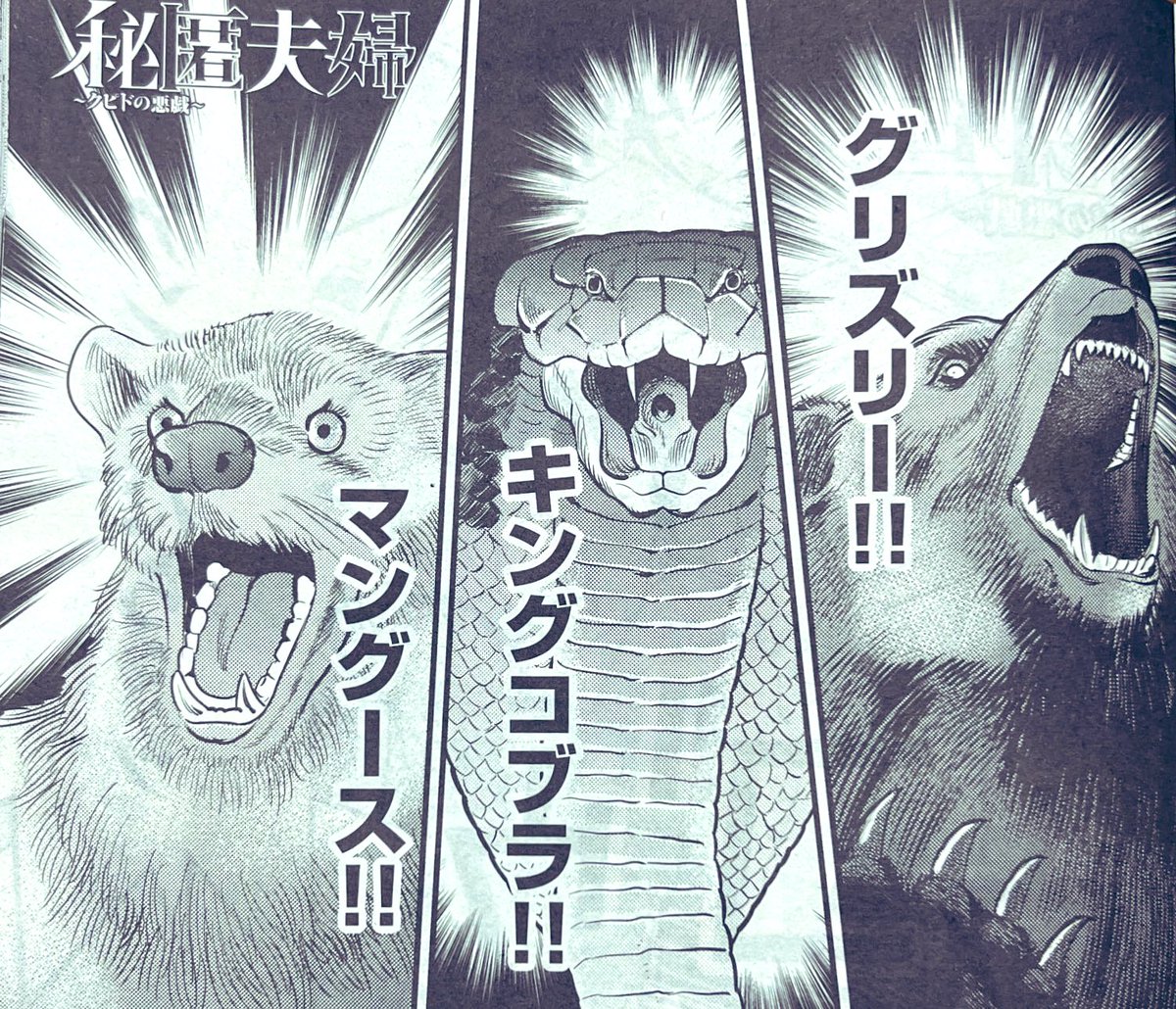 【宣伝】本日発売の週刊漫画ゴラクに『秘匿夫婦〜クピドの悪戯〜』最新話掲載されています!グリズリー!キングコブラ!マングース!他にも獣さん達がいっぱい! よろしくお願いします。 #秘匿夫婦クピドの悪戯 #漫画ゴラク