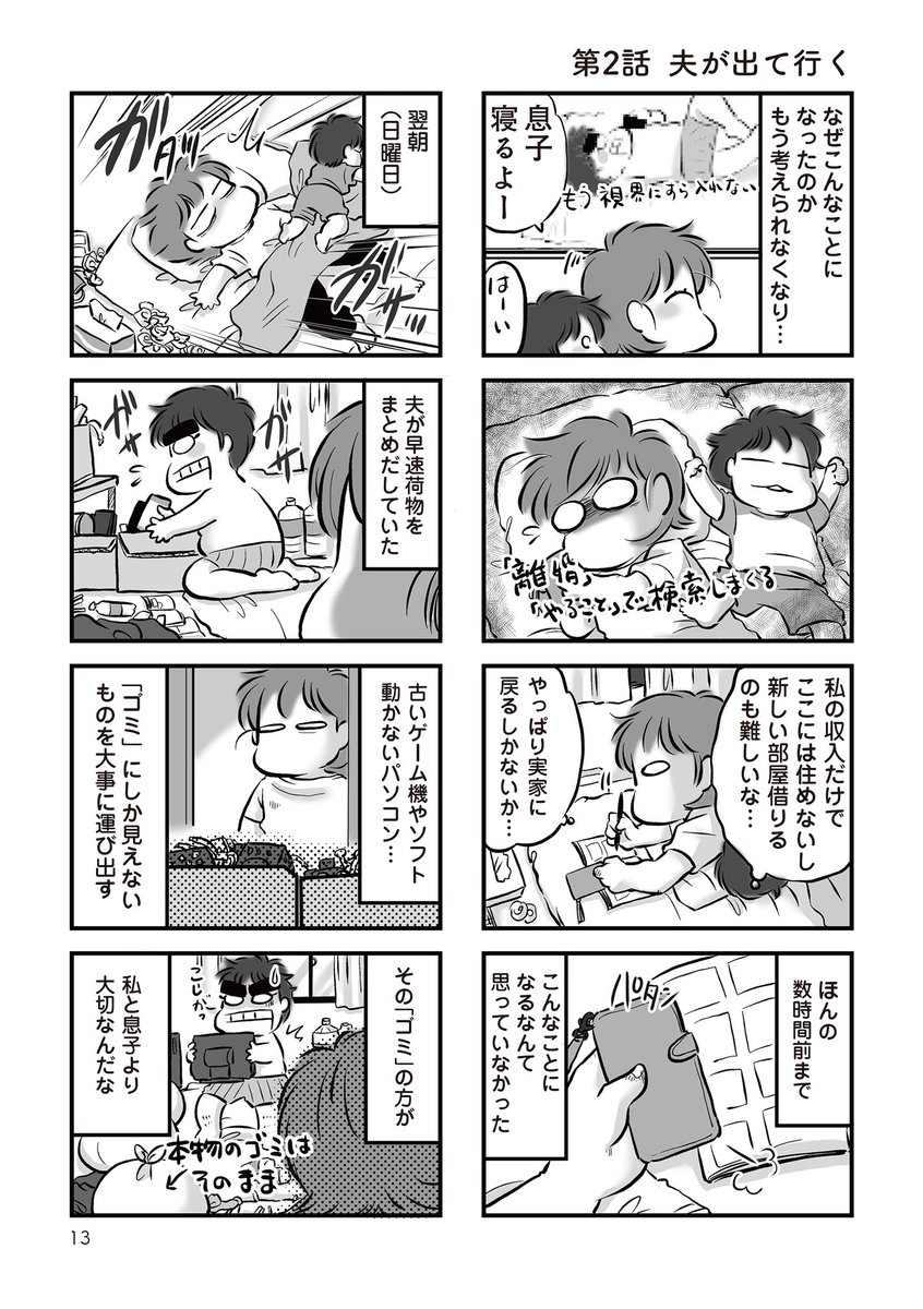 #無職の夫に捨てられました 2話 1/3 #漫画の読めるハッシュタグ #コミックエッセイ #離婚 「家族」を」捨てて「ゴミ」を持って。
