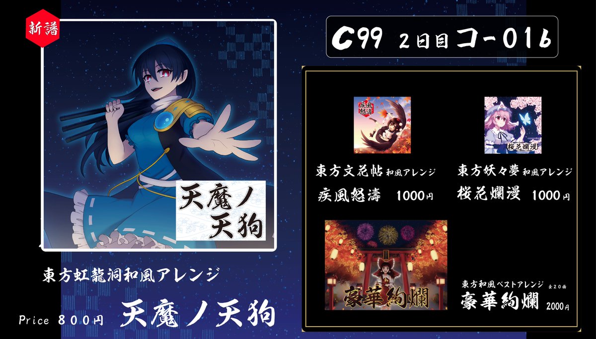15 18 C99のお品書きになります! 新譜は東方虹龍洞の和風アレンジCDとなっております。 新譜名 天魔ノ天狗 スペース 東6 コー01b にてお待ちしております。 BOOTH の予約も開始しました! soundrefil.booth.pm/items/3540821 #C99 #東方Project 21/12/28 21:19