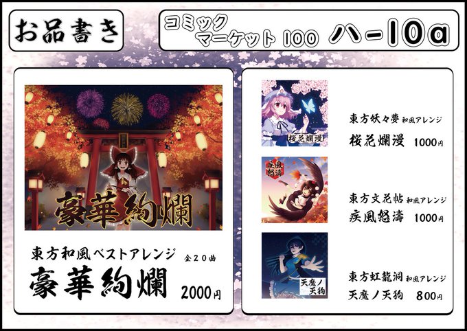 C99のお品書きになります! 新譜は東方虹龍洞の和風アレンジCDとなっております。 新譜名 天魔ノ天狗 スペース 東6 コー01b にてお待ちしております。 BOOTH の予約も開始しました! soundrefil.booth.pm/items/3540821 #C99 #東方Project