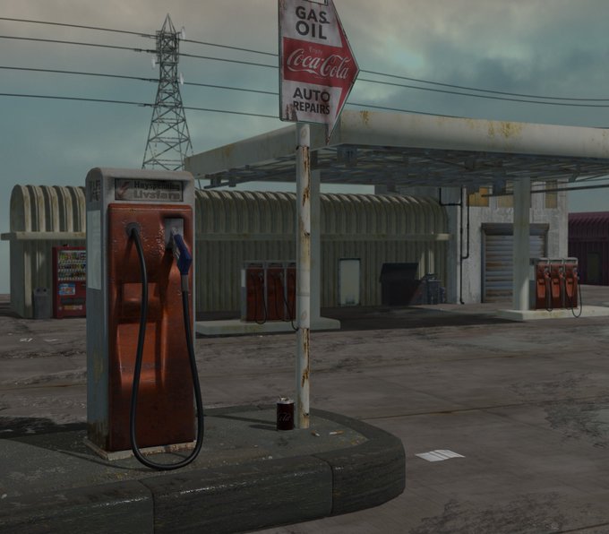 blender100日チャレンジ 13日目 20年間放置されたガソリンスタンド 良い感じの荒廃感ある。なのに自販機は今でも動いてるってね #blender #b3d #Blender3d #blender初心者 #3dcg #100日チャレンジ #写真 #に見えたらいいなあ