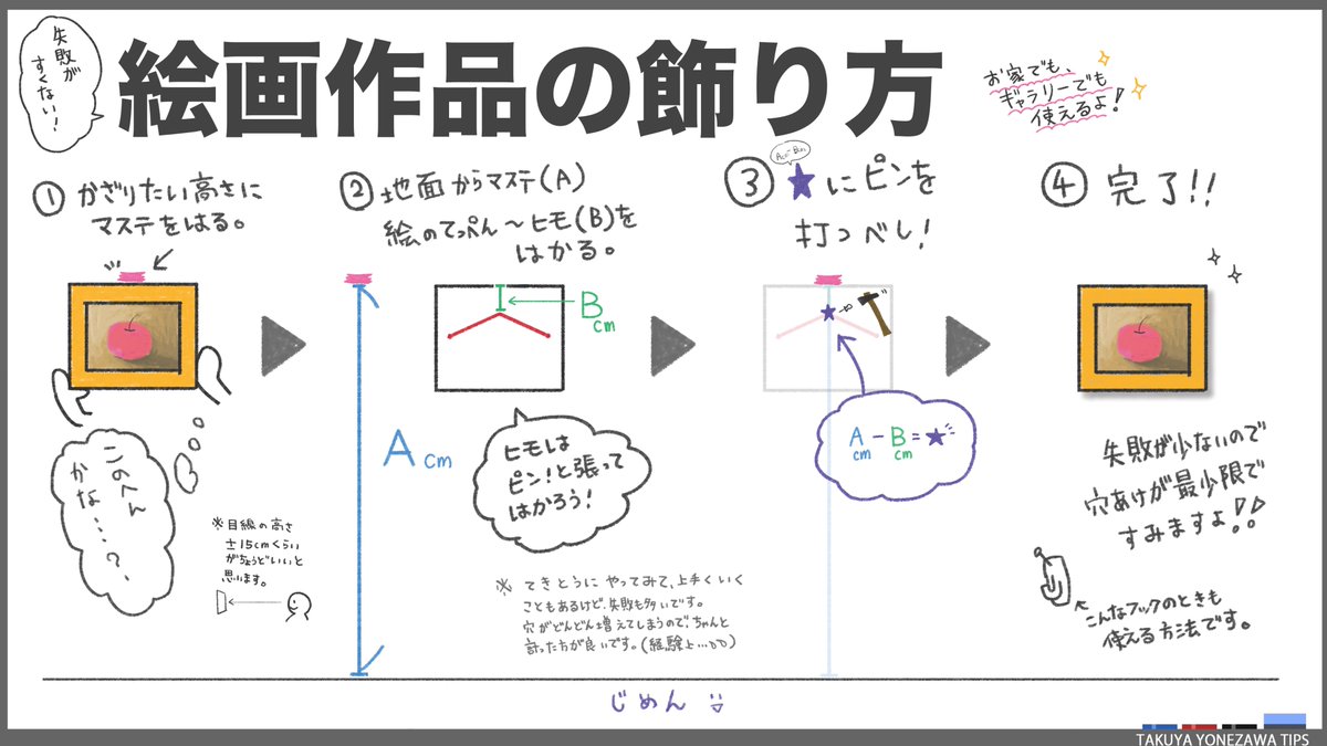 絵画作品の飾り方をまとめました。 絵やポスターを飾る時って、感覚でやりがちですが、失敗も多いです。アタリをつけて、少し計算をすることで、壁の穴も、所要時間も減るので、お家で作品を飾るのが好きな方や、ギャラリーで展示をする絵描きさんなどに、ご活用いただけたら嬉しいです🖼️ twitter.com/i/web/status/1…