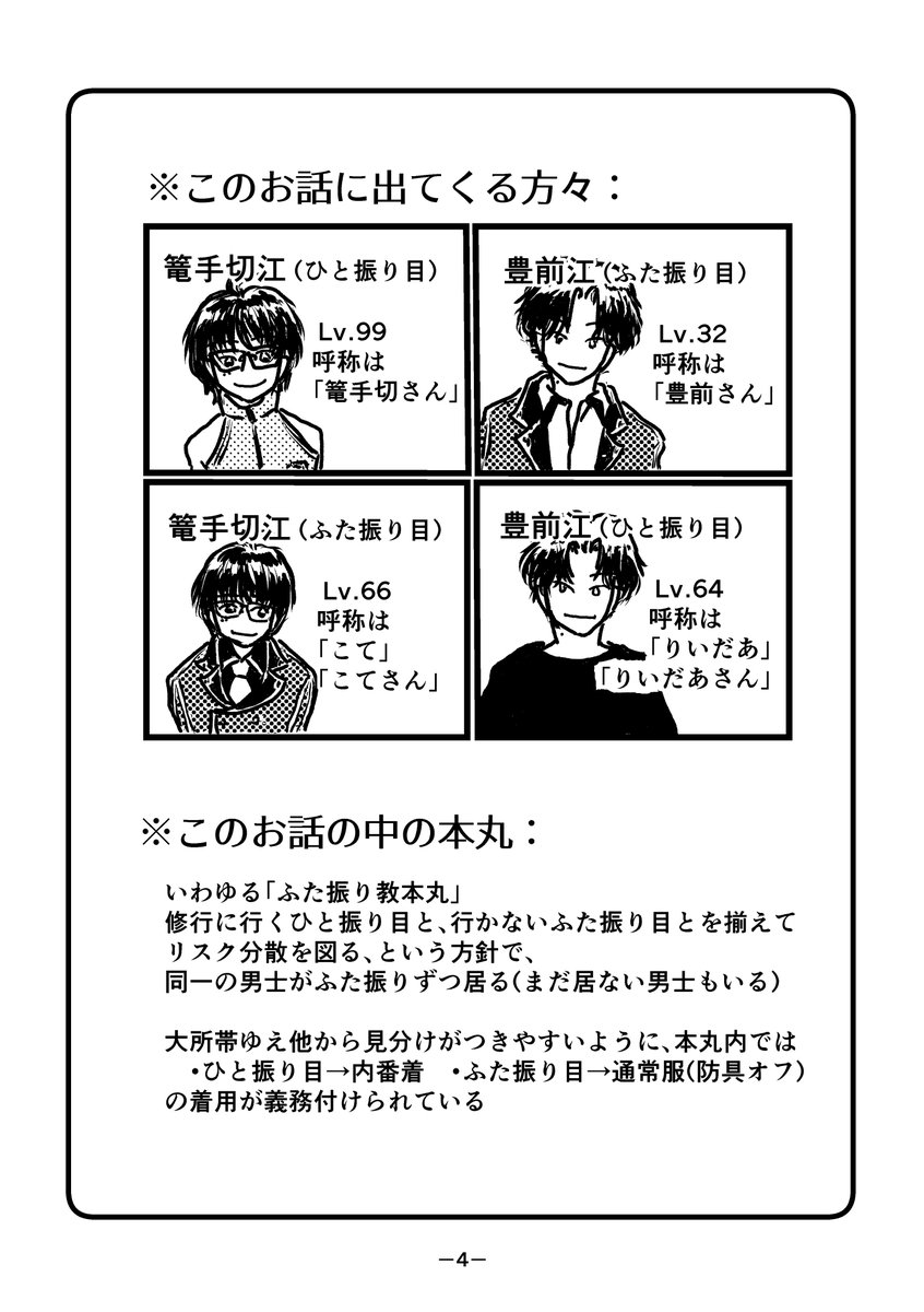 3 1 【春コミ新刊サンプル1/3】特・極併存のため各男士がふた振りずつ居る、とある本丸にて。すていじあくと1を経験「しなかった」方のこてぶぜのお話です。 2年前にお出しした本の続きですが、前作を読んでいなくても差し支えないように描いたつもりです。よしなに。以下ツリーにサンプルを。 22/03/20 22:01