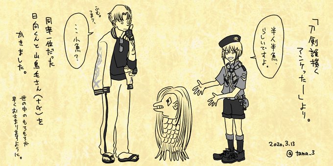 14 23 先日のアンケったーのお題絵を描きました。日向くんと山鳥毛さんとプラスαです。ご投票くださった皆様有難うございました。そして、世の中のもろもろが早くおさまりますように。 20/03/13 22:37