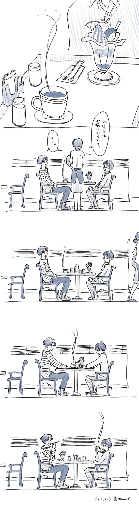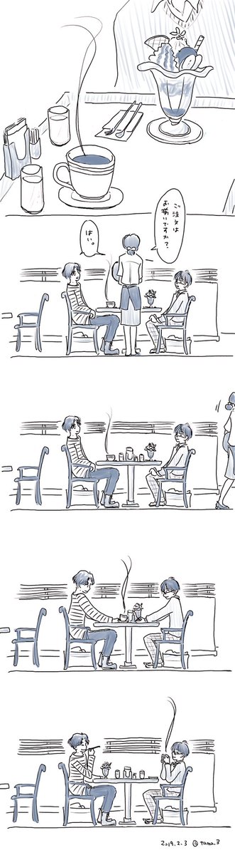 175 622 きょうのらくがき。何日か前にTLで話題になってた、「注文した品を逆に置かれる篭手切さんと豊前さん」を描きました。 19/02/03 17:19