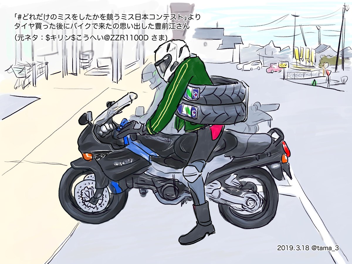 37 68 さておき。ミス日本コンテストタグより、タイヤ買った後にバイクで来たの思い出した豊前江さんをかきました。(元ツイの方にかいてよいかは確認済みです。二次創作のご快諾有難うございました。) 19/03/19 07:05