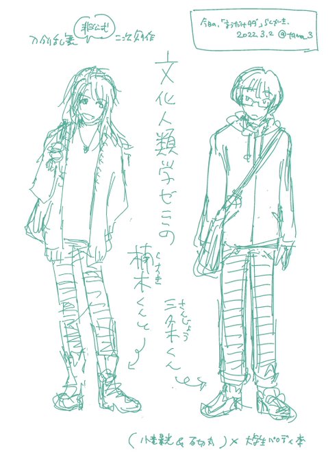 0 6 今日の落描き。ゼミの黒二点のお二方が親交を深める学パロのご本を描きたいなー、という妄想をいったん鎮めるために描きました。ラブの有り無しは今のとこ未定。 22/03/02 23:40