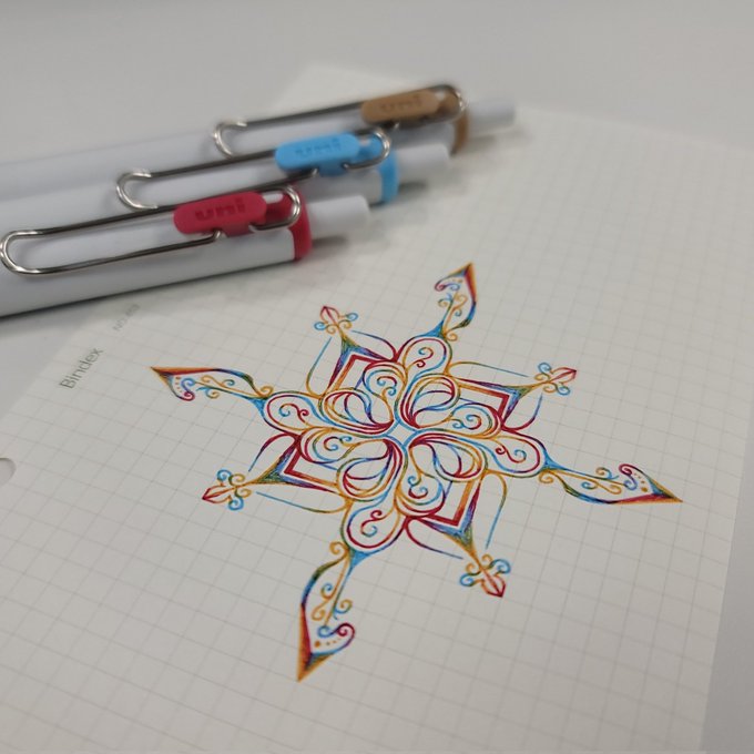 みんな……みんな聞いて……三菱鉛筆のユニボールワンすごい…… 冬のカラーセットで綺麗な模様とグラデが描けたからうはうはでお外で撮ったら……風が強くて水の中にドボン。 でも!!滲まない!! 水性顔料ゲルインキってすごーい…… (喜んでいいのか悲しんでいいのか) 綺麗に乾くといいな……