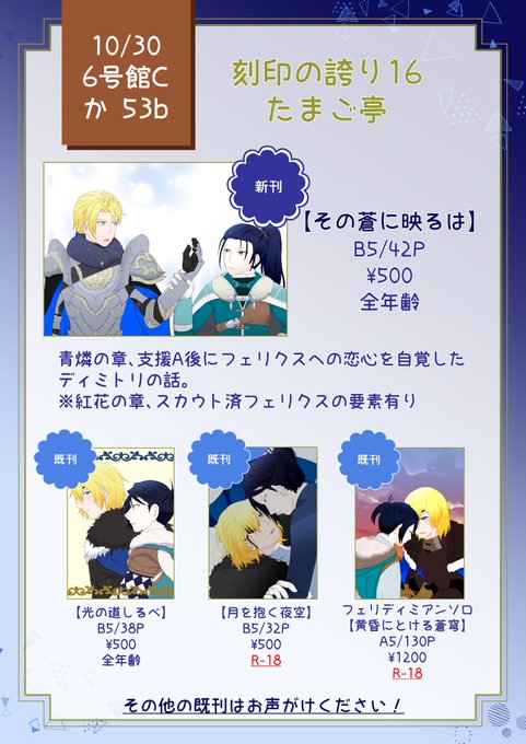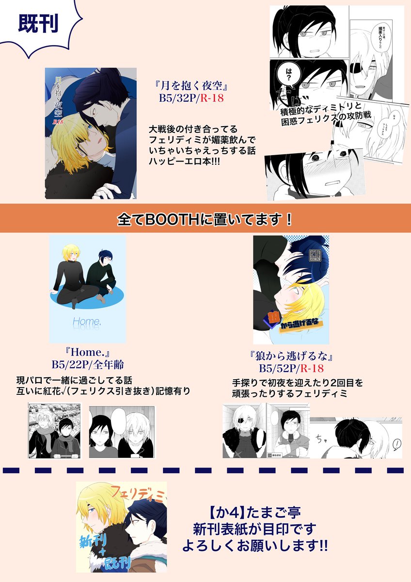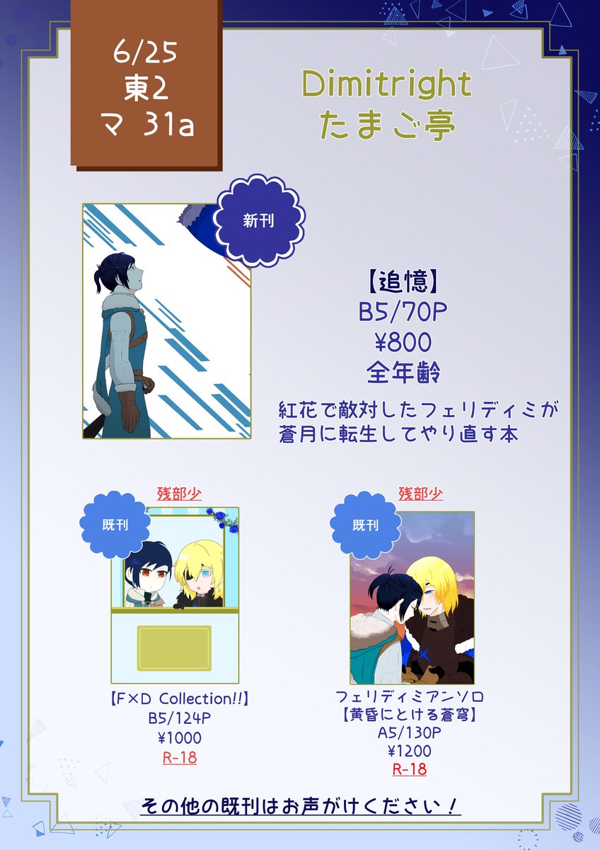 6/25 Dimitrightお品書きです📃 『東2 マ31a たまご亭』でフェリディミ新刊既刊持って行きます!既刊は残部少なめですすみません🙇♂️ 当日よろしくお願いします!! pixiv.net/artworks/10918…
