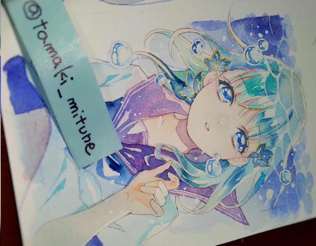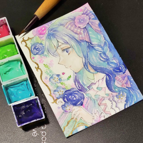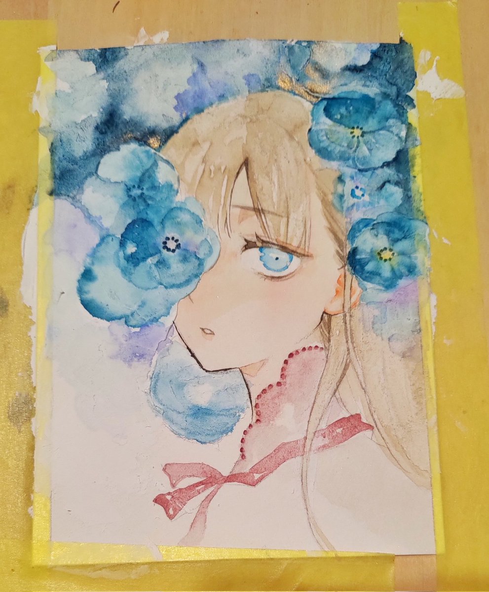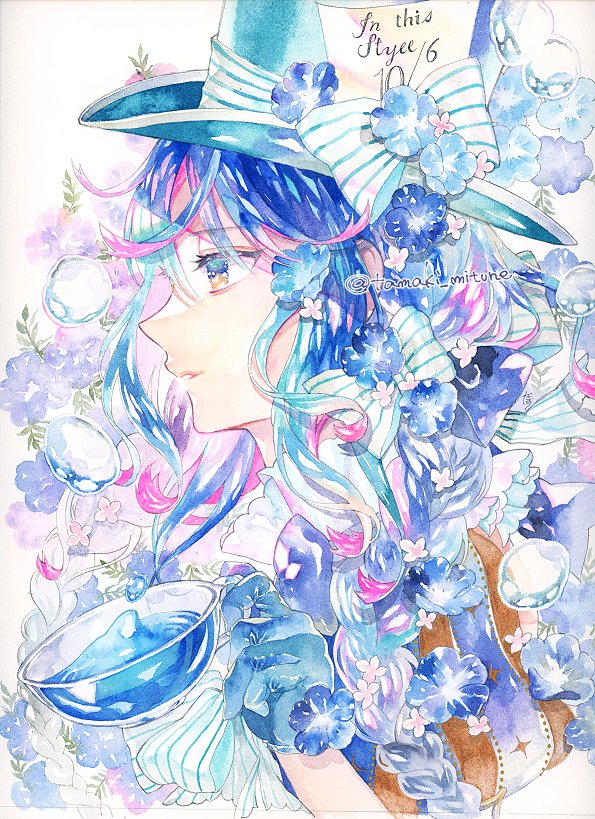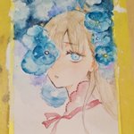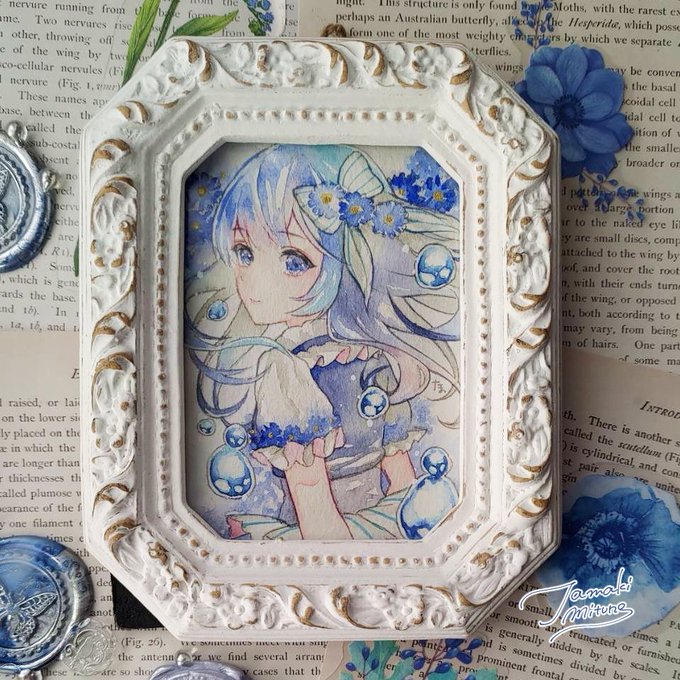 「ブルーデイジー×Bubble」 八角形の可愛い額に合わせて青でまとめた少女を描きました gallery-glad.amebaownd.com #ちいさなタカラモノ展2 #透明水彩 #watercolor