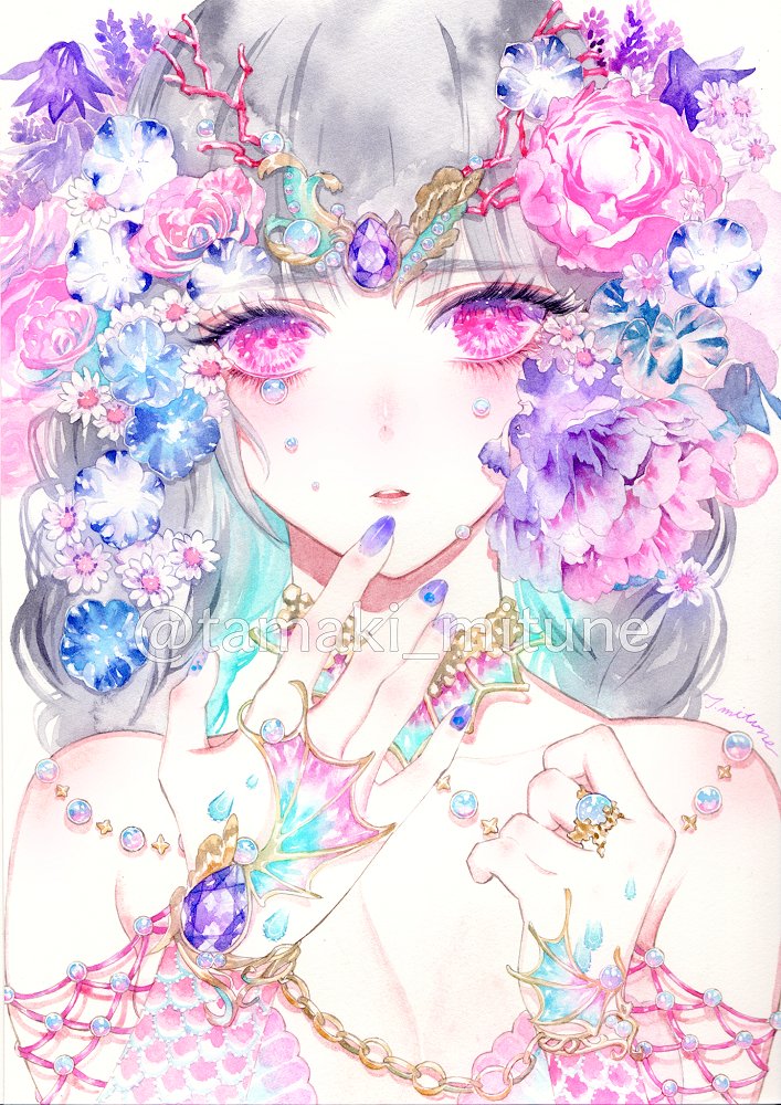 ちいさなタカラモノ展、メインで描いた作品 お花のパーツも水彩で着色し絵のような雰囲気に仕上げました、ミスティッククォーツとフローライトをぶら下げています✨ 「ネモフィラ×Mystic Quartz」 「桜×Fluorite」 gallery-glad.amebaownd.com #ちいさなタカラモノ展2 #透明水彩 #watercolor