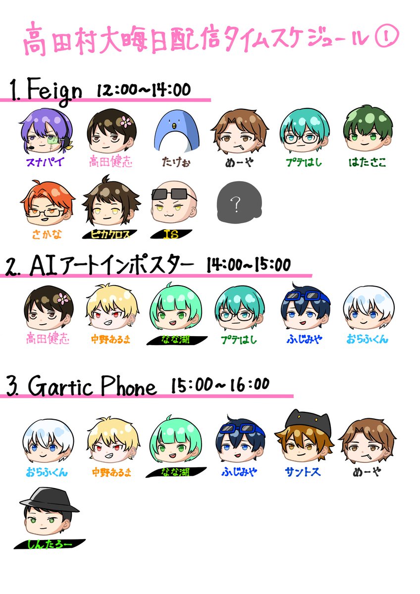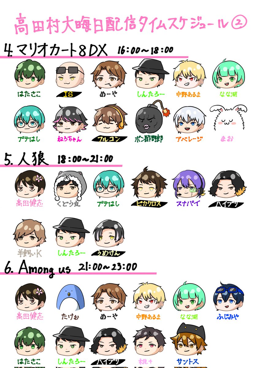 高田村大晦日配信のスケジュールまとめ 間違いがあってもご容赦くださいませ ※名前の黒ラインは見やすくするためだけなので特段意味はないです #高田村 #高田大好きちゅちゅアート