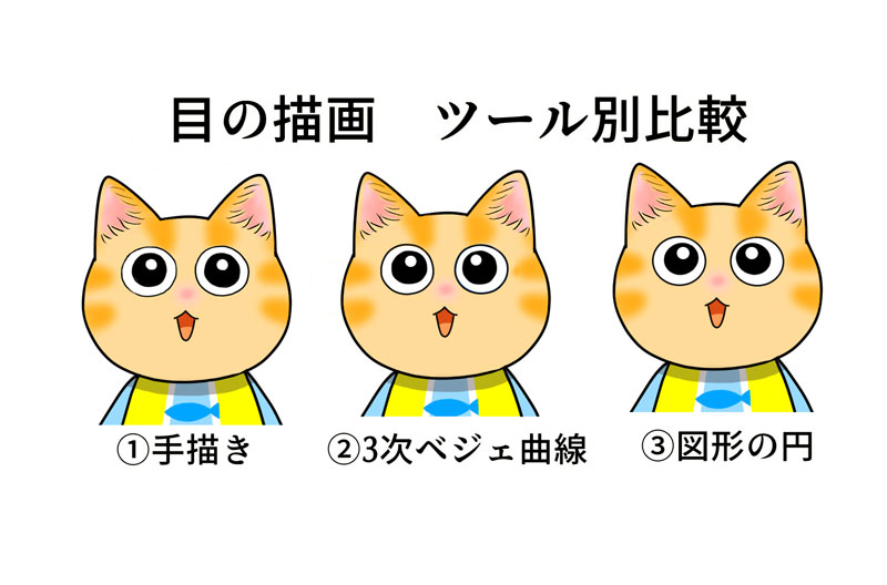 目の部分だけ使用ツールを変えて描画、比較してみました。 ①画面をめいっぱい大きくして描かないと歪む。線の強弱がつけられる。めんどい。 ②ストレスなく描ける。微調整できる。ややめんどい。 ③図形を重ねるだけ。微調整できる。簡単。 決めかねています。 #デジタルイラスト #使用ツール比較