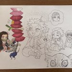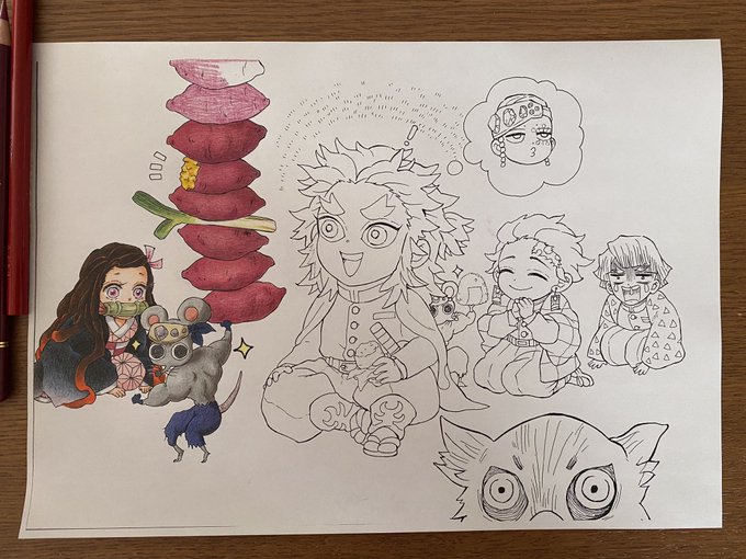 0 7 初めて描くミニキャラの途中経過です^^;🎨 (※食べ物以外は模写の組み合わせです) ちょこちょこ塗っているので、まだ日数かかりそう🕰 #鬼滅の刃イラスト #アナログイラスト #模写 #途中経過 #色鉛筆イラスト #コピー用紙 22/05/29 18:13