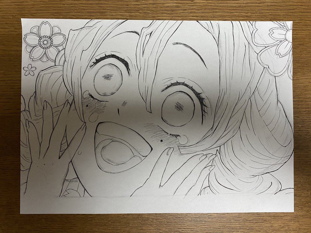 0 5 午後になってから描き始めたので全然間に合っていない、蜜璃ちゃんの誕生日イラスト🌸 急いで描いているので、あまり似ていなくても妥協したり、色々「あっ💦」となりながら(^^;; #鬼滅の刃イラスト #途中経過 #甘露寺蜜璃 #一応模写 22/06/01 20:07