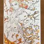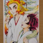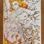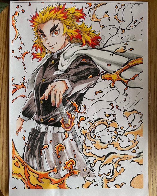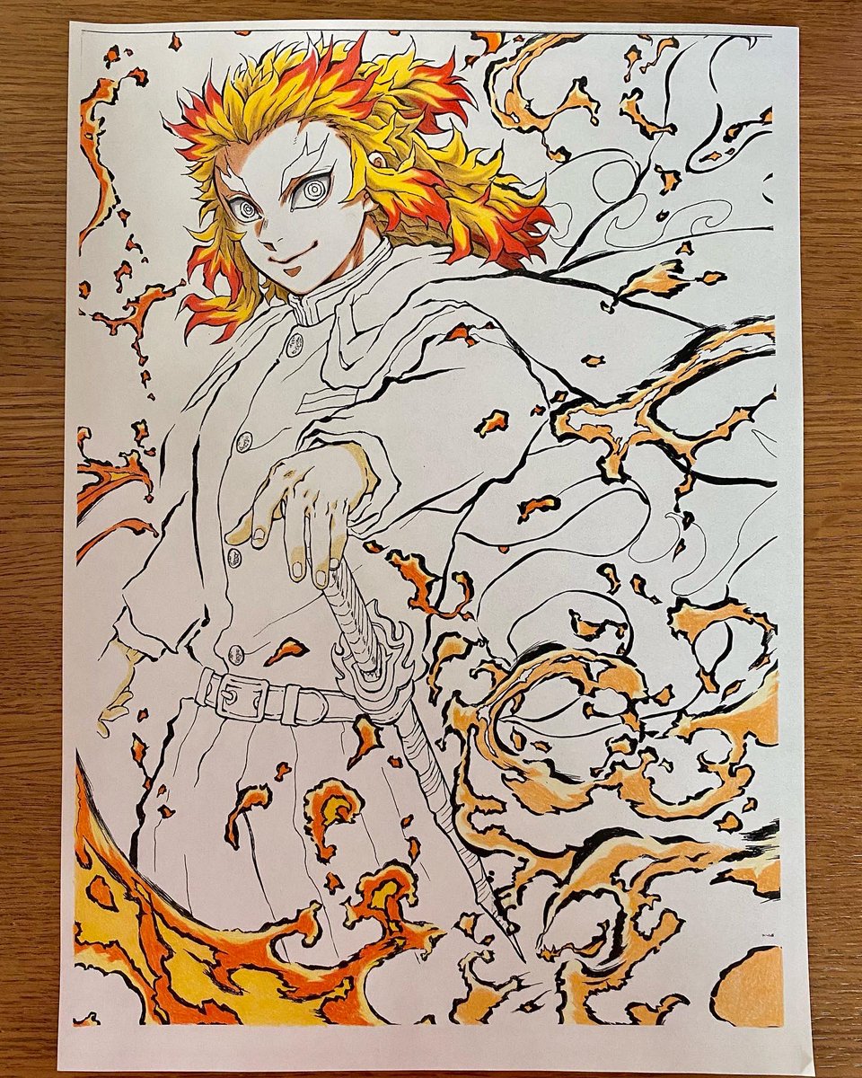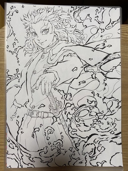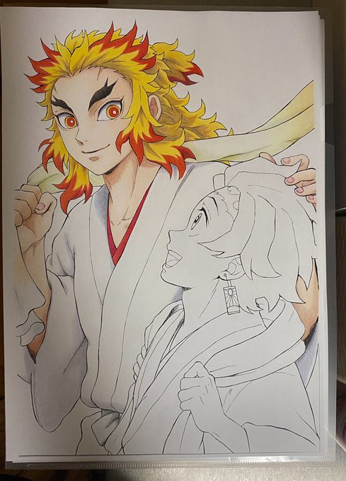 「もし炭治郎が煉獄さんの継子になっていたら」 模写しかできない自分にとってはチャレンジの、模写アレンジの途中経過です^^; 色を塗ったらよりわかるというか、やっぱり煉獄さんの目と目の間隔がやや空いてしまってる👀💧 でもこのまま完成まで塗っていく予定です🎨 #鬼滅の刃イラスト #コピー用紙