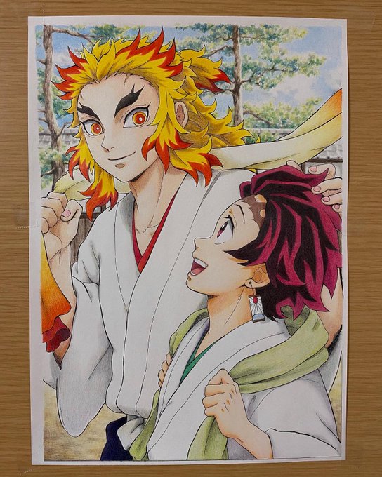 「もし炭治郎が煉獄さんの継子になっていたら」 39枚目の鬼滅の刃イラスト、模写アレンジの煉獄さんと炭治郎が完成✨🎨 模写しかできない自分にとってはチャレンジでした^^;💨 時間の長さではないけど、でもたった一晩というのは、短すぎて😢🚂🌃 #鬼滅の刃イラスト #アナログイラスト #色鉛筆イラスト