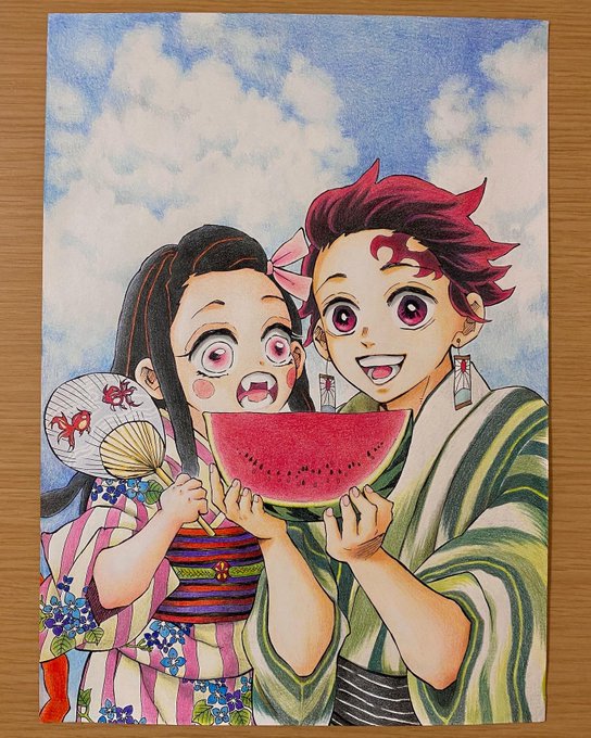 41枚目の鬼滅の刃イラスト、炭治郎の今年の誕生日イラストがようやく完成✨ (誕生日当日は去年のイラストを投稿) 何だか暑中見舞いのような雰囲気に仕上がったけど^^;w🎐 改めて、誕生日おめでとうございました☺️🎉 ※炭治郎の浴衣の模様を見本と変えています #鬼滅の刃イラスト #模写 #色鉛筆イラスト