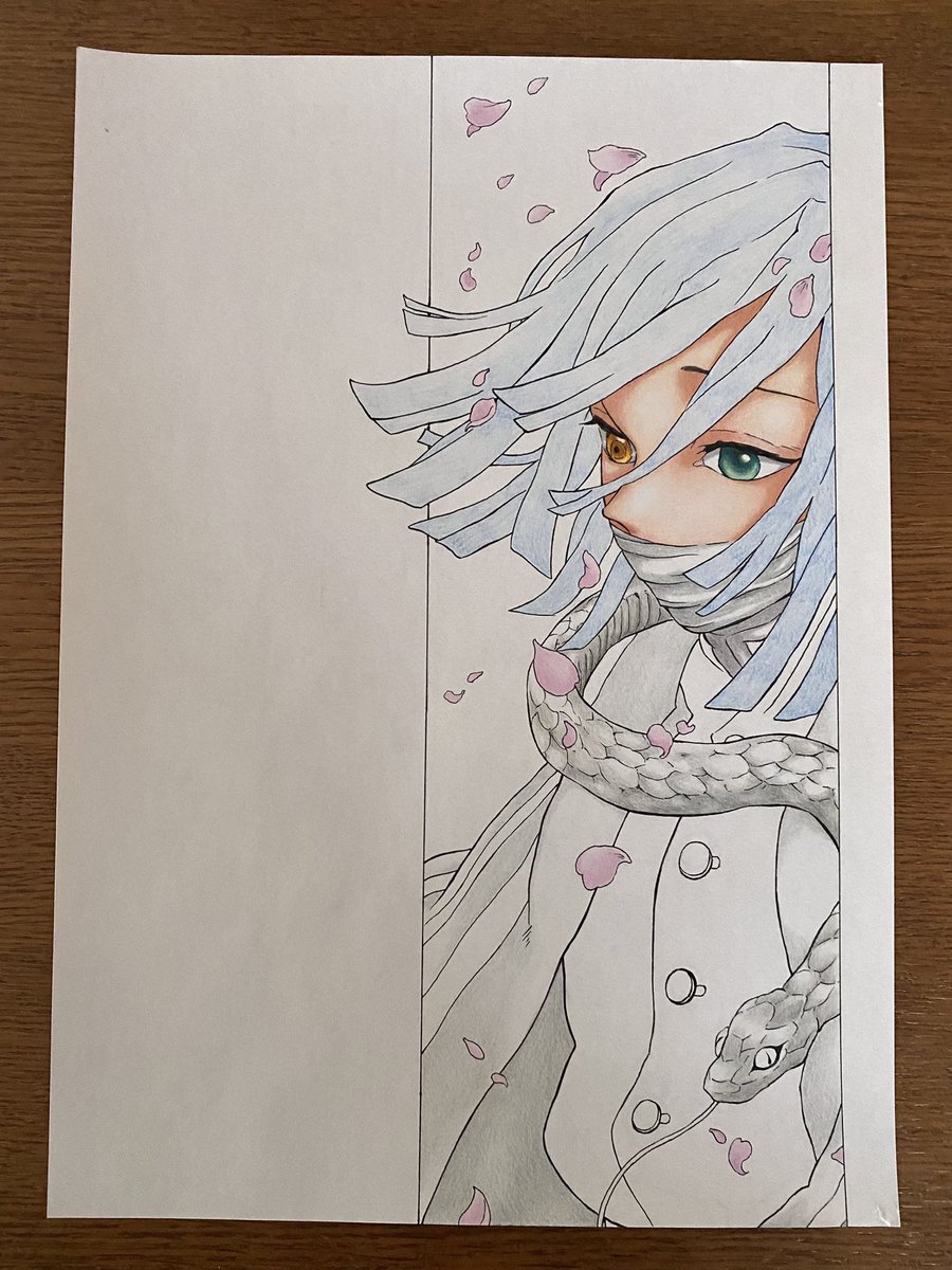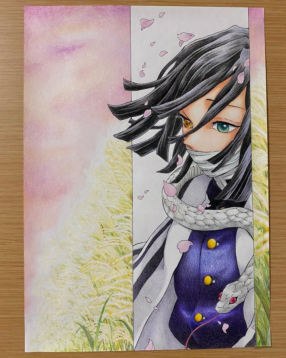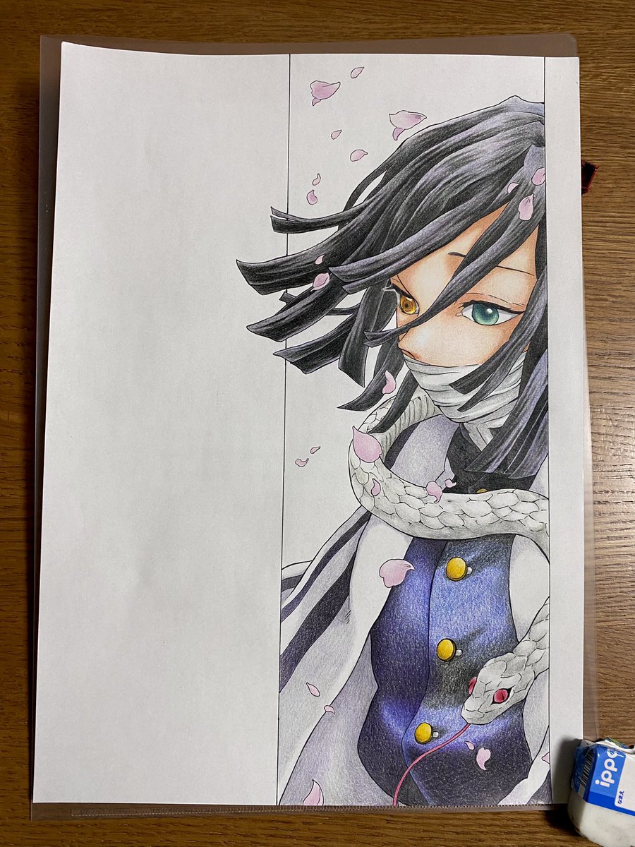 44枚目の鬼滅の刃イラスト、コミック最終巻の伊黒さんが完成✨🍀 出かける予定だったのが家になったので、昨日の今日で完成 ネチネチしているけど、一途で、柱としての責務を全うする姿はカッコいい☺️🐍 #鬼滅の刃イラスト #アナログイラスト #色鉛筆イラスト #模写 #伊黒小芭内