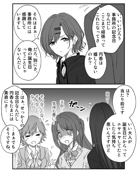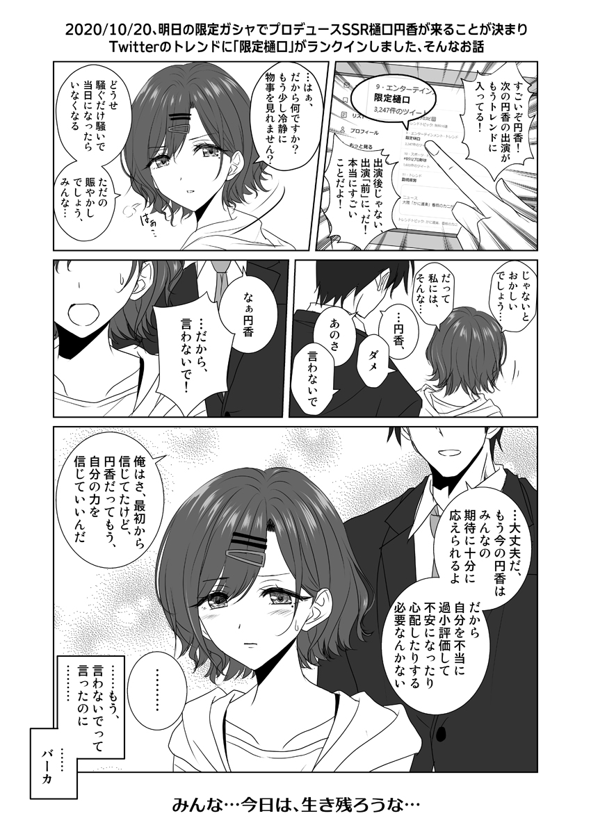 樋口円香誕生日おめでとう漫画 頑張れプロデューサー ひぐちーおめでとーー 最近親愛信頼高い樋口が多かったので初期型樋口はなかなか描いてて新鮮でした Pixiv→pixiv.net/artworks/85262… #シャニマス #樋口円香 #樋口円香生誕祭2020