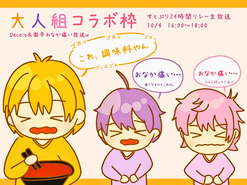 大人組コラボ放送ありがとうございました!!✨ 豹変するDeceitに激辛におなかをやられていく大人組…ほんとにいっぱい笑わせてもらいました!!✨ お腹ゆっくり休めてくださいw( *´꒳`*)✨ #すとぷり24時間リレー生放送 #すとぷりギャラリー #ジェルくん #なーくん #さとみくん