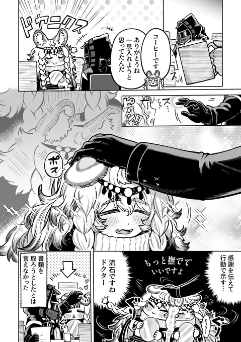 649 2535 プラマニクスと差し入れをするドクター。 (ユキヒョウへの配慮は大切である) コミッションのプラマニクスの漫画です。すごく可愛いので皆さんも見て下さい。 こちらは可山@bokiboki333さんに作成してもらいました。 #アークナイツ 22/07/26 15:00