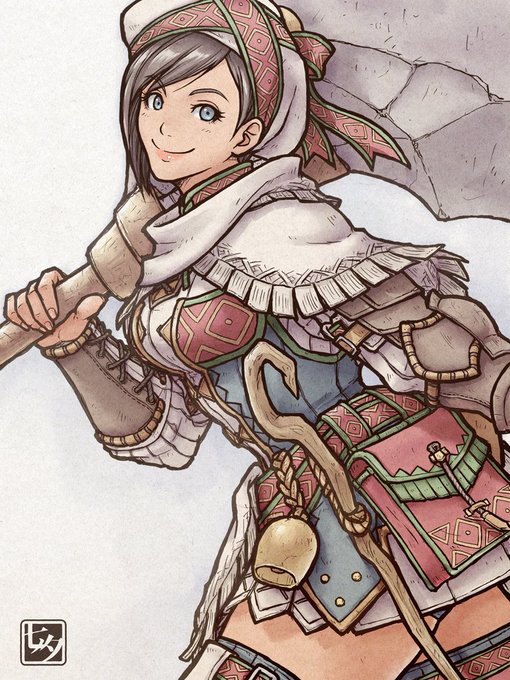 MHクロスの初期装備も良いよね! というわけでベルダーシリーズです。 羊飼い(ムーファ飼い?)を思わせる、 のどかさを感じるデザインがお気に入りです。 いつか重ね着で復活して欲しいなぁ。 あと、OPムービーのハンマーお姉さんが とにかく可愛くて好き。 #モンハン #MonsterHunter #fanart