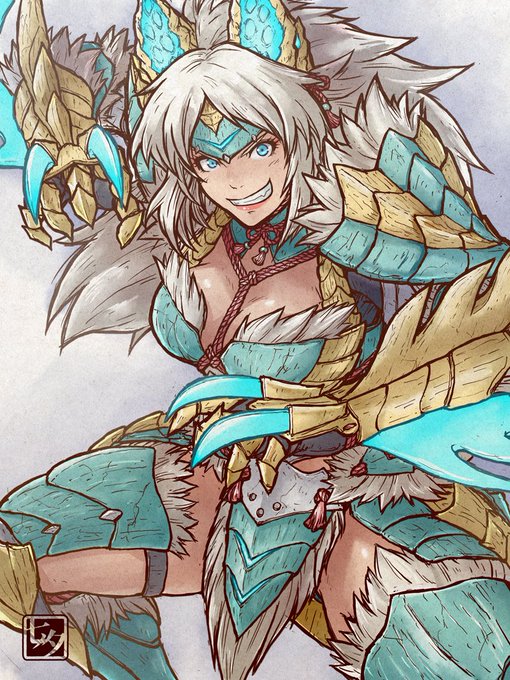 モンスターに近い見た目の防具って良いよね! というわけで、GXジンオウ装備です。 まるでジンオウガが人の姿となったかのようなワイルドさ、そして犬耳がツボです😊 テンション上がって思わずポーズ決めるハンターさんもいたりして、なんて思いながら描きました。 #モンハン #MonsterHunter #fanart