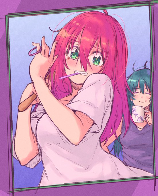 297 1262 ルビィと善子が勉強会するっていうので飲み物とか持って行ったら「オギャア、ルビィから生まれる~~」って言いながらルビィのお腹に潜り込んでる善子ちゃんを目の当たりにしてから、妹と視線が合った黒澤ダイヤ視点のイラスト描きました。よしルビってやつやね…ッ 22/11/13 21:57