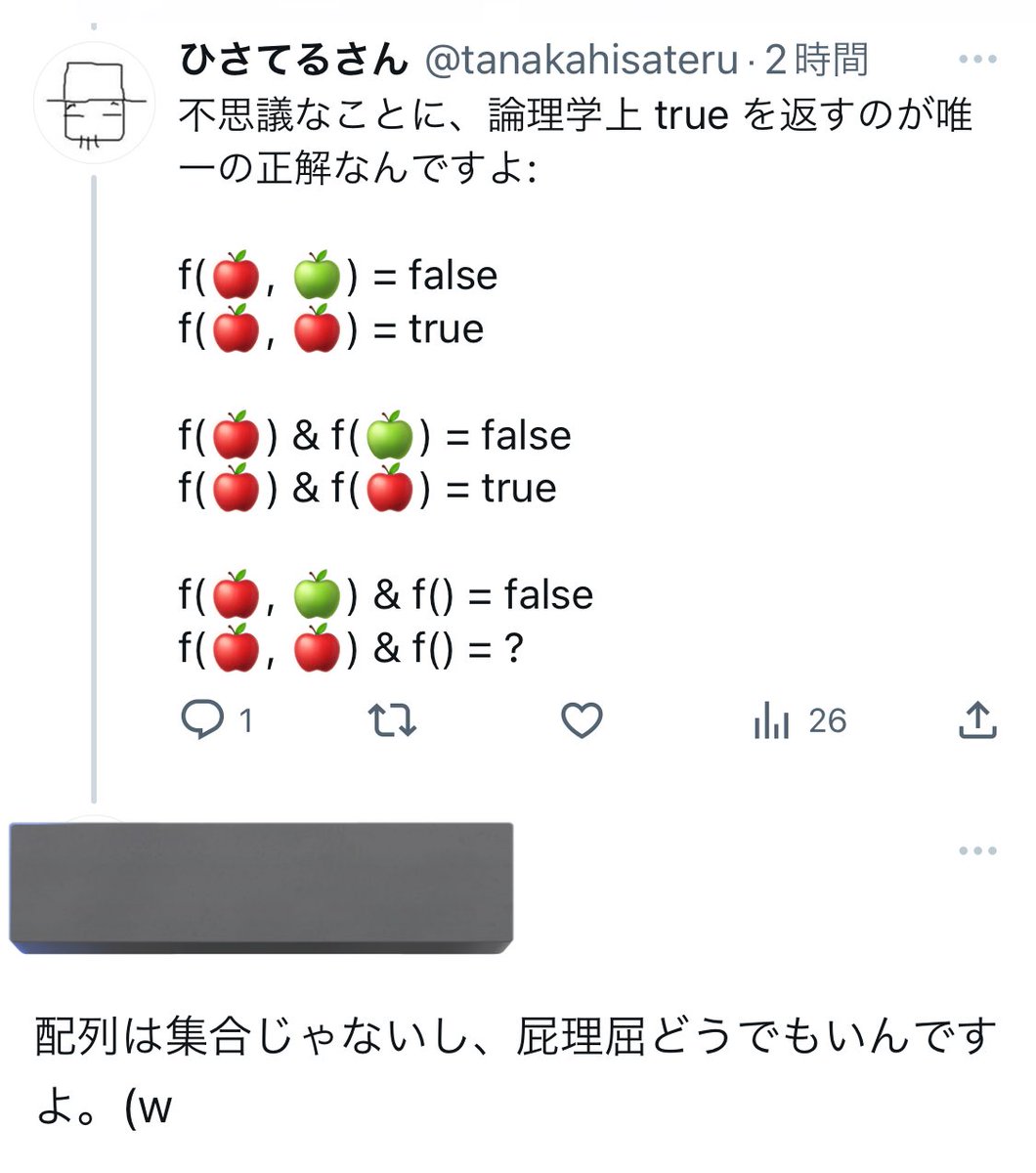 171 915 空配列の問題は、論理学の知識ないヤツはプログラマーやめろとかどうでもよくて、人の都合と無関係に普遍的な正解がある数学的思考の大事さだけに着目すればよいと考えていたのですが、これはさすがの私も、もし同僚にいたらプログラマー辞めてくれって思ってしまいました 23/05/31 14:12