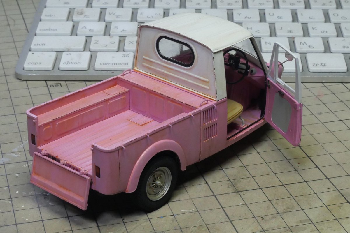 KAモデルズのマツダK360、発売当時に作り始めて途中でそのままになっていたものが、ようやく形になりました。開閉選択式のドアとリアゲートはヒンジを設けて開閉可能としました。全体に繊細で軽自動車のか弱さがよく再現された良キットでおます。 #今月作ったプラモ晒そうぜ