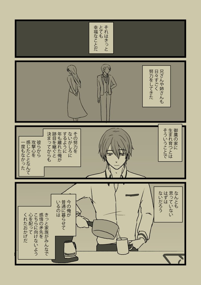 個人の願望500%で御鷹くんが昼ドラに思うところがあった話を描きました。※ご家族のビジュアルを捏造しています。 #ワヒロ_FA 誰か見てくれたらいいなーの気持ちでタグを拝借するけど万人向けかはわからん