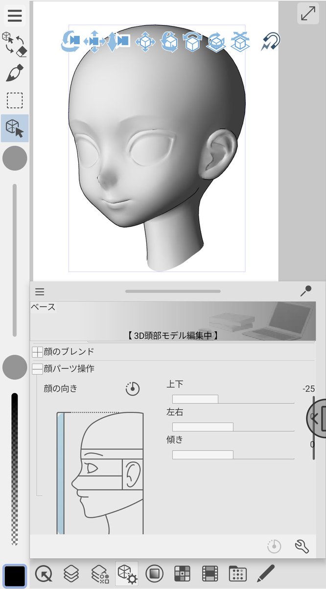 クリスタ2、Android版でお試し!3Dベースヘッド、目も鼻も耳も細かくカスタムできるの嬉しすぎるー!!全身3Dは今まで通りだけど、ベースヘッドを同じ3Dレイヤー上に入れたらカメラ回転で体と顔同じ角度で見れるね!(重ねるのも可能。体の動きとは連動しないけど)#CLIPSTUDIOPAINT
