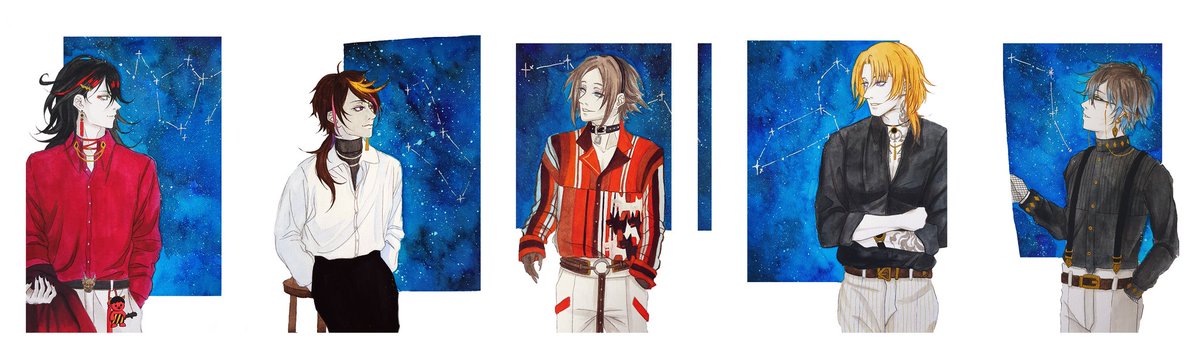 It's late but happy first anniversary, Luxiem! May you always be our hope in the dark ❤️💜🧡💛💙 Constellations: 👹 Phoenix 👟 Puppis (The Poop Deck 💩) 🦊 Vulpecula (The Fox) 🦁 Leo ✒ Caelum (The Chisel) #Akurylic #YaminoArt #MystArt #drawluca #Ikenography #LuxiemAnn1versary