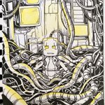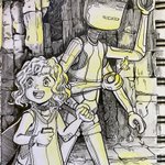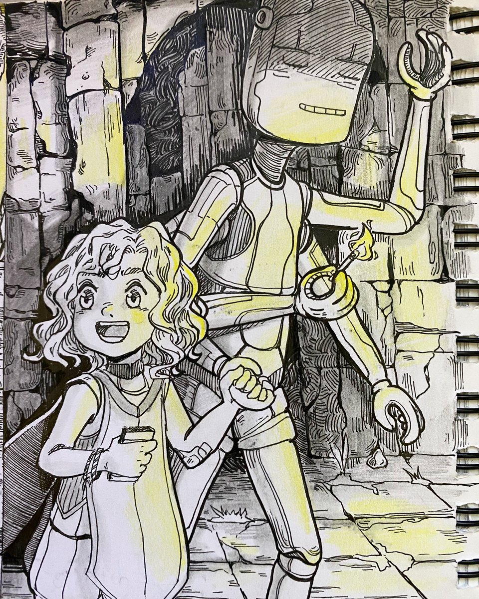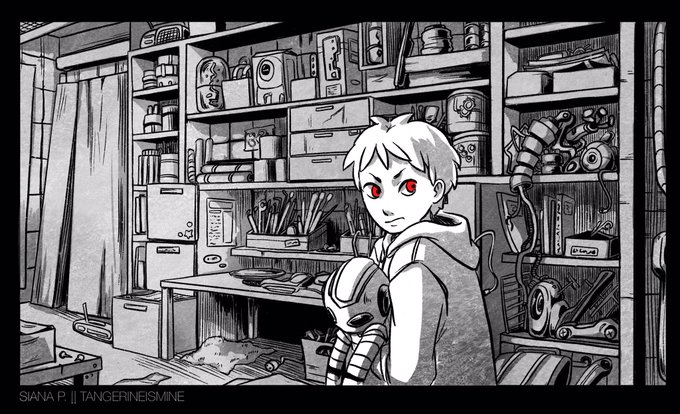#inktober 5: Build. He found a repair shop! Maybe there’s something there that can help fix the little robot? #inktober2019 #digitalinktober @Procreate #illustration #comicart #comicbookart #scifiart #manga #robot