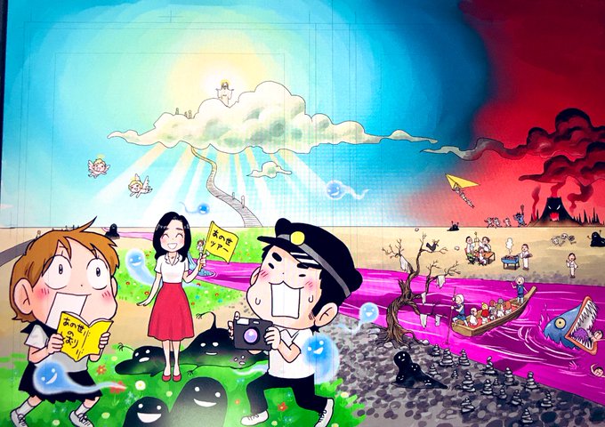 木曜日発売のあの世の社会科見学の表紙イラストは今回見開きで描きました。 これをいい感じに表紙に組んでいただいたデザイナーさんのセンスが光る表紙に仕上がっています。 絶妙な位置バランスの調整と何より ロゴがカッコいい!✨