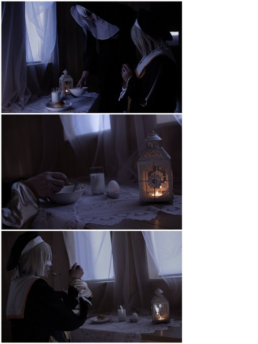 ⚠️捏造注意【 #コスプレ/ #Cosplay 】 教団の教えで、聖なる豆と、聖なるミルクと、聖なる卵と果物しか食べれないんです。 ……いいえ、大事にされてましたよ mhyk 教団のリケ(@tanimmi) シスター:(@KiR_0104) 📷:(@usagitamagoyaki) #まほやく_cos