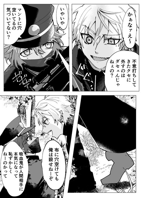 59 756 #くろのあとりえ 軍人と吸血鬼の小話(3/3) ※2人が戦ってます この後何やかんやあって最後は共闘する展開になって欲しいです 21/10/03 12:33